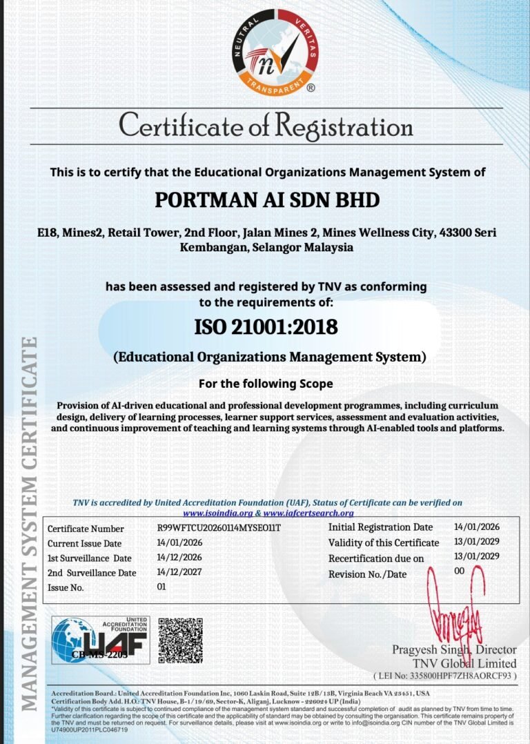 At PORTMAN AI, we aren’t just building the future of education; we are certifying it. Our ISO 21001:2018 accreditation represents a historic bridge between cutting-edge AI innovation and world-class educational management. For our learners and partners, this means every AI-driven curriculum and personalized learning path we develop is governed by the highest international benchmarks for quality, ethics, and learner success.